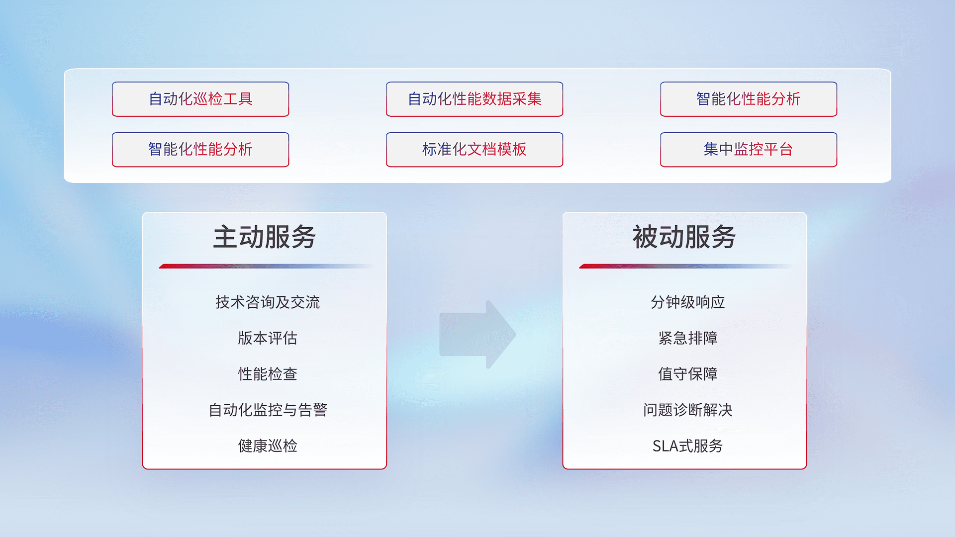智能化工具和标准化文档,,保障服务质量,,,,提供主动服务(包含技术咨询、、版本评估、、性能检查、、、、自动化监控与告警、、、健康巡检)和被动服务包含(分钟级响应、、紧急排障、、、值守保障、、问题诊断解决、、SLA服务)。。。。
